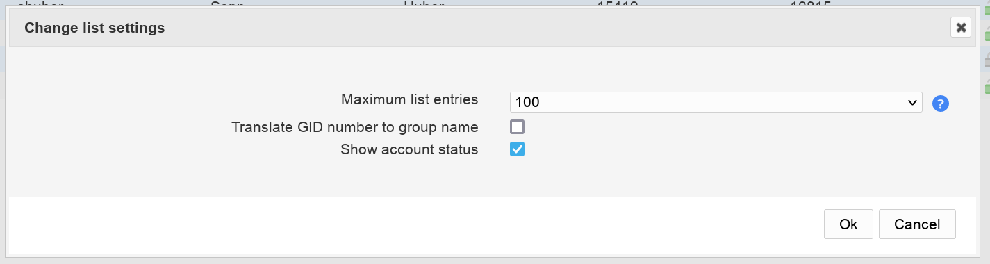 You can change the number of shown entries per page with "Change settings". Depending on the account type there may be additional settings. E.g. the user list can convert group numbers to group names.