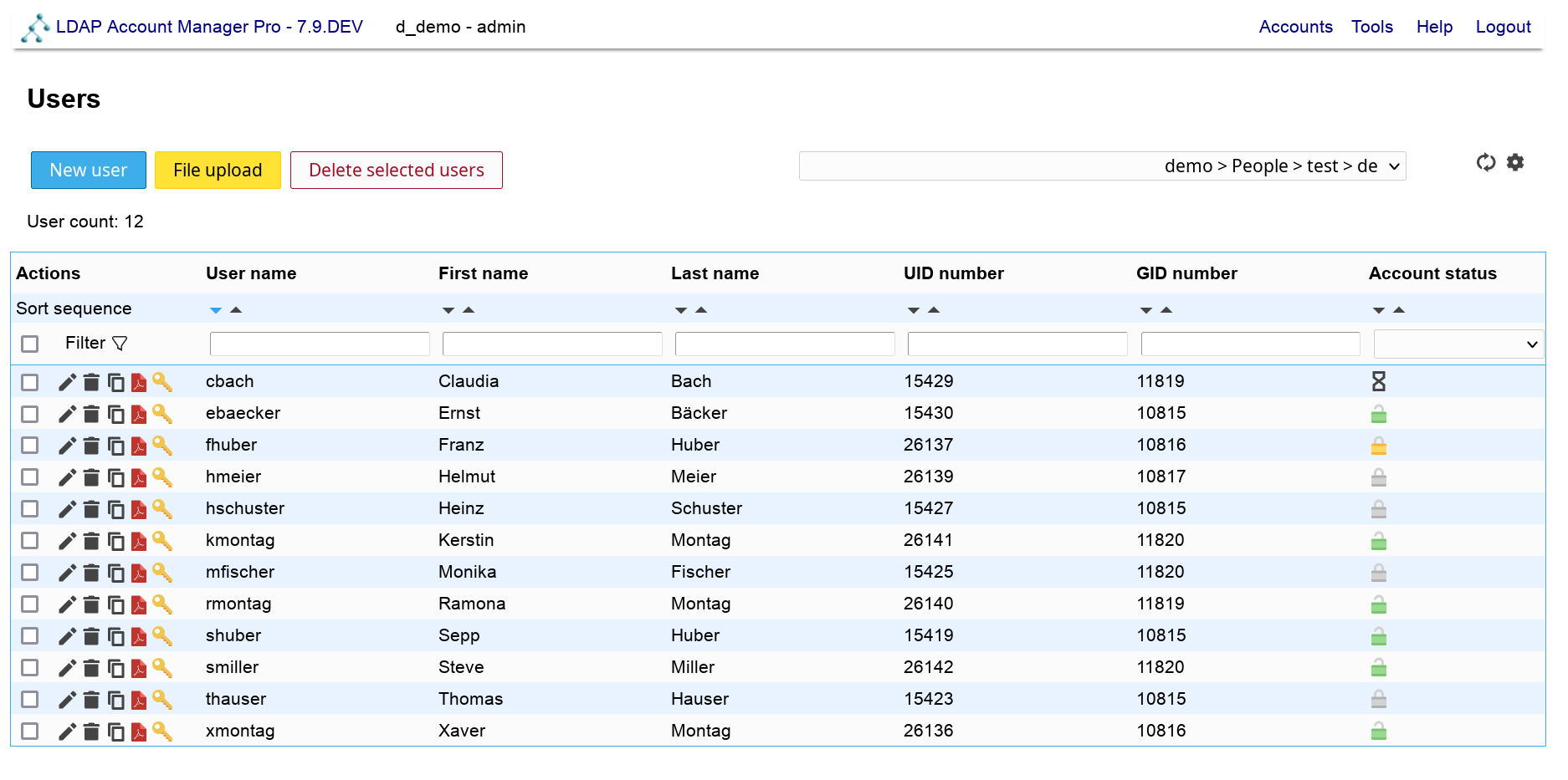 The header part includes the links to manage all account types (e.g. users and groups). There is also the logout link and a tools entry.