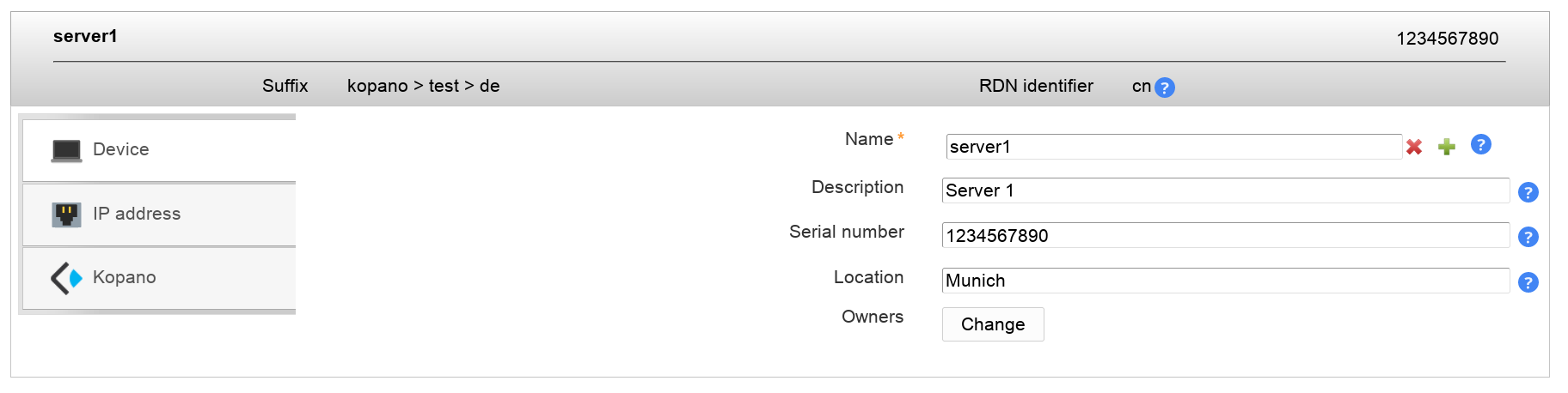 The device object class allows to manage general information about all sorts of devices (e.g. computers, network hardware, ...). You can enter the serial number, location and a describing text. It is also possible to specify the owner of the device.