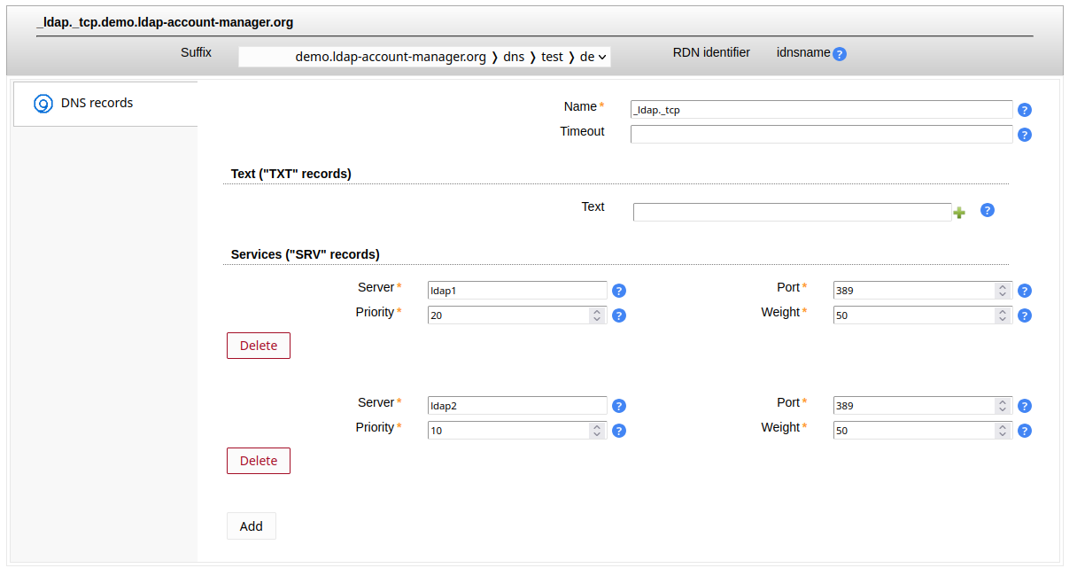 Service records can be used to specify which servers provide common services such as LDAP. Please note that the host name must be _SERVICE._PROTOCOL (e.g. _ldap._tcp).