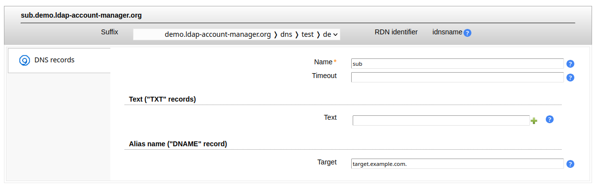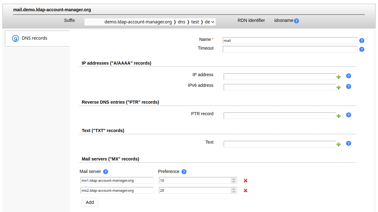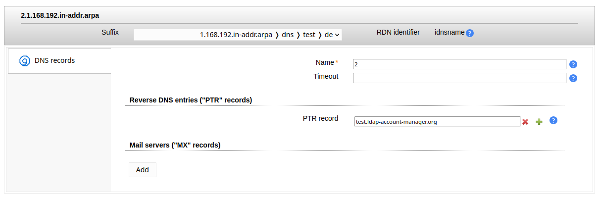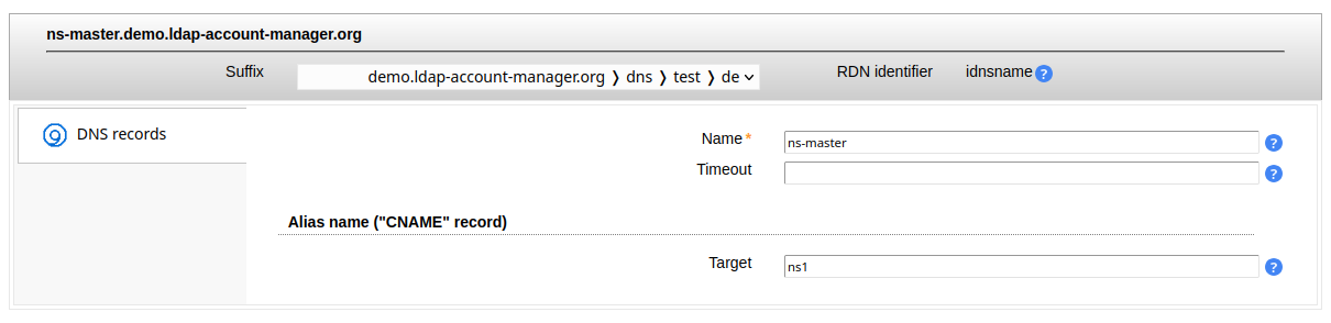The bind-dyndb-ldap plugin for Bind allows you to manage DNS entries in LDAP. Please install the bind-dyndb-ldap schema file on your LDAP server. It is part of the bind-dyndb-ldap download. LAM Pro can manage DNS zones and the following record types: