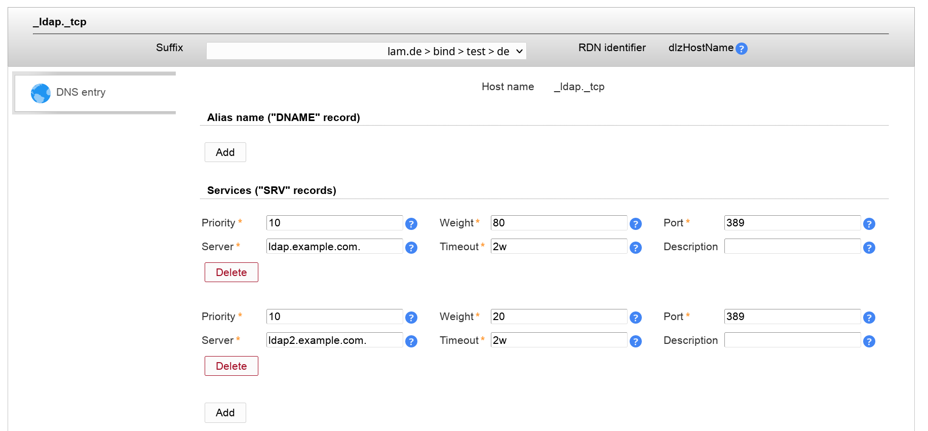 Service records can be used to specify which servers provide common services such as LDAP. Please note that the host name must be _SERVICE._PROTOCOL (e.g. _ldap._tcp).