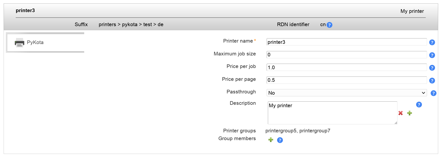 Please add the account type "Printers (PyKota printers)" on tab "Account types" in your server profile and setup the LDAP suffix where printers are stored.