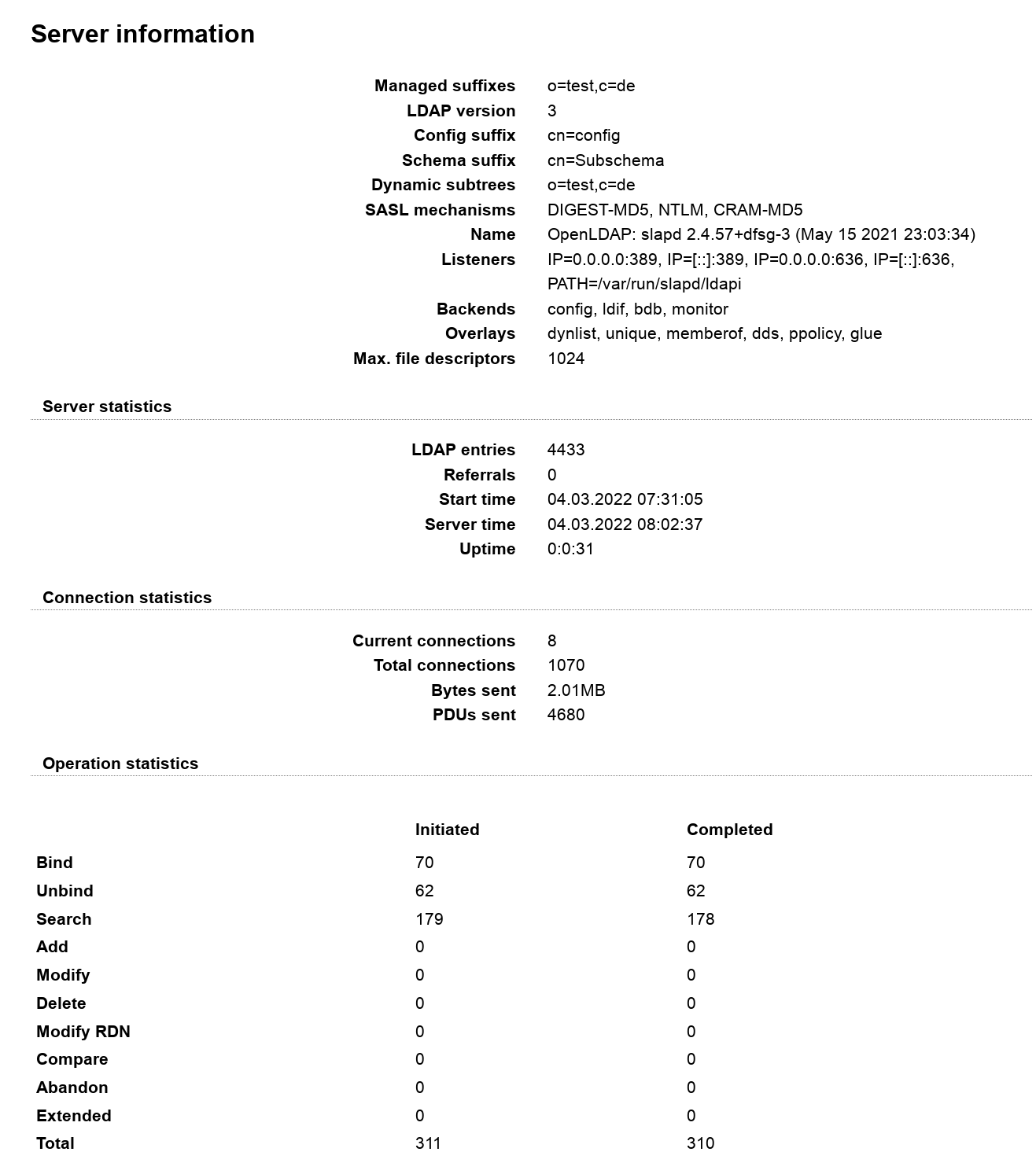 This shows information and statistics about your LDAP server. This includes the suffixes, used overlays, connection data and operation statistics. You will need "cn=monitor" setup to see all details. Some data may not be available depending on your LDAP server software.